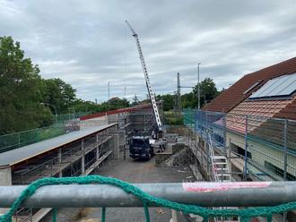 Die Bauarbeiten selbst haben zunächst mit der Einrichtung der Baustelle begonnen (siehe folgendes Bild). In den nächsten Wochen sind am Bestandsdach, nach Aufstellung des Gerüstes, Demontagearbeiten notwendig. Im Anschluss können die neuen Bauteile dann moniert werden.