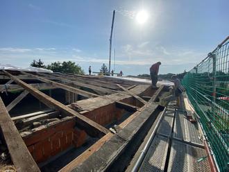 Anschließend wurde das Dach bereichsweise geöffnet. In diesem Zusammenhang konnte die tragende Dachkonstruktion auch von oben in Augenschein genommen und in den erforderlichen Bereichen lokal ausgetauscht bzw. ertüchtigt werden (siehe Bild). Bei dieser Gelegenheit (geöffnete Dachhaut) wurde im Bereich der obersten Geschossdecke eine zusätzliche Dämmschichtstärke verlegt.