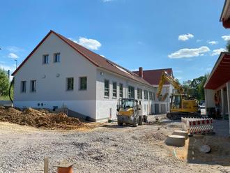 In den nächsten Wochen steht die abschließende Höhenprofilierung und Oberflächenbefestigung zwischen dem Neubau (Betriebshofhallen) und dem Bestandsgebäude an. Anschließend werden die Pflanzarbeiten aufgenommen.