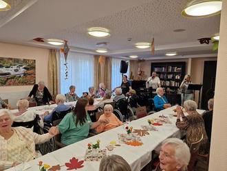 Dies fand zum Einen in der Cafeteria des Hauses statt. Hier genossen unsere Bewohnerinnen, Bewohner mit ihren Angehörigen selbstgemachten Kartoffelkuchen bei musikalischer Umrahmung durch „Dreiklang“, die Gassenhauer wie „Die Hände zum Himmel“, „Tulpen aus Amsterdam“, „Vugelbeerbaam“, „ Aber dich gibt’s nur einmal für mich“ zum Besten gaben und viel Fröhlichkeit und Lebensfreude verbreiteten.