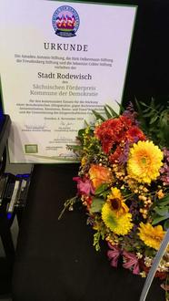 Unsere Stadt Rodewisch erhielt am 6. November 2024 im Dresdner Staatsschauspiel den Sächsischen Kommunenpreis für Demokratie der Amadeu-Antonio-Stiftung. Bürgermeisterin Kerstin Schöniger und Zentrenmanagerin Babett Ludwig, in Vertretung des Stadtbüro-Teams, durften den Preis in Empfang nehmen. Die Jury lobte die Kommune mit den Projekten ROWI Labor und ROWI Stadtbüro für die bürgernahe Kommunalpolitik und den Einsatz für die Teilhabe aller Bevölkerungsgruppen. Die Förderung des ehrenamtlichen Engagements sowie das breite Spektrum an Veranstaltungen sind ein weiterer wichtiger Baustein der Arbeit. Mehr als 30 Ehrenamtliche, die sich rund um das Stadtbüro engagieren, gehören dabei zum Team und haben dazu beigetragen, dass das Labor mehr und mehr zum Mitmachlabor wurde.