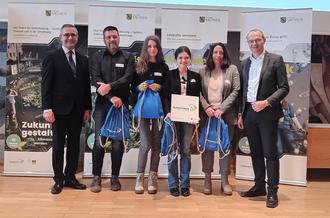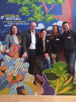 v.l.: Marco Hertwig (Leiter des Ministerbüros im Sächsischen Staatsministerium für Kultus, Herr Löst, Cara Abelein (9a), Laurelin Richter (10c), Frau Aurich, Wolfram Günther (Sächsischer Staatsminister für Energie, Klimaschutz, Umwelt und Landwirtschaft)