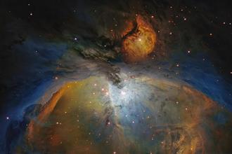 Der diffuse Nebel Messier 42 ist der hellste und auffälligste Teil einer viel größeren Gas- und Staubwolke, die sich quer durch das gesamte Sternbild Orion zieht. Die Gesamtausdehnung dieser Assoziation erreicht in Wirklichkeit mehrere Hundert Lichtjahre. M42 ist eine aktive Geburtsstätte junger Sterne in etwa 1600 Lichtjahren Entfernung.