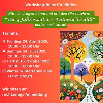 In unserer kreativen Workshop-Reihe entdecken Kinder im Alter von 8 bis 12 Jahren die vier Jahreszeiten durch Musik und Kunst. Gemeinsam mit der Künstlerin Jacqueline Maschke tauchen sie in die Welt von Antonio Vivaldis „Die Vier Jahreszeiten“ ein und erkunden die Farben der Natur in jeder Saison.