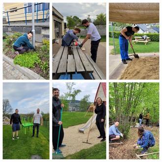 Es wurden Malerarbeiten, Gartenarbeiten, Rasenpflege, Reinigungsarbeiten, Reparaturarbeiten und vieles mehr von unseren Helfern für die Kinder in Angriff genommen. Sandkästen wurden aufgelockert und neuer Fallschutz unter den Klettergeräten verteilt.