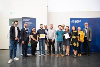 Übergabe der Auszeichnung während der Veranstaltung in der Technischen Universität Dresden: Andreas Petermann, Wissensfabrik; Wilfried Kühner, Amtschef im Staatsministerium für Kultus; Sylvia Schöne, LJBW Landesjugendbildungswerk Sachsen; Hans Unger, Schüler BSZ; Sebastian Löschner, Lehrer BSZ; Karsten Zielke, Lehrer BSZ; Luca Hentschel, Schüler BSZ; Hagen Schädlich, Lehrer BSZ; Nadine Höfer, Schulverwaltungsassistentin BSZ; Ivonne Milek, Fachleiterin BSZ; Nadja Bauer, Schulkontaktstelle TU Dresden; Prof. Dr. Christoph Meinel, Vorstandsvorsitzender MINT Zukunft e. V. (von links nach rechts)