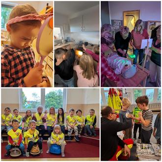 Am 6. Oktober begannen die Herbstferien, in denen sich in der ersten Woche alles um das Thema „Berufe“ drehte. Wir sammelten Ideen, welche Berufe es gibt, in welche Gruppen man sie einteilen kann und natürlich, welchen Traumberuf wir einmal haben möchten. Ein besonderes Highlight war der Besuch von zwei Rettungssanitätern der Falck Rettungsdienst GmbH, die mit ihrem Rettungswagen zu uns kamen. Die Kinder durften das Fahrzeug von innen anschauen, erfuhren, welches Equipment im Einsatz benötigt wird, und konnten sehen, wie ein Patient behandelt wird. Passend zum Thema bastelten wir Kastanienmännchen in verschiedenen Berufen, spielten ein „Berufe-Activity-Quiz“ und besuchten schließlich das neue Brand- und Katastrophenschutzzentrum in Eich. Dort lernten die Kinder, wie die Feuerwehr arbeitet, welche Gefahren es gibt und wie man im Notfall Hilfe holt. Besonders spannend war der Rundgang über das Außengelände: Die Kinder sahen, wie sich Feuerwehrleute auf Einsätze vorbereiten, durften Jacken anprobieren, Sauerstoffflaschen und Atemmasken ausprobieren und beobachteten, wie Feuerwehrschläuche gereinigt werden. Natürlich durften auch die großen roten Feuerwehrautos bestaunt werden!