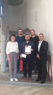 Im Bild zu sehen: Bürgermeisterin Kerstin Schöniger, Herr Felix Spitzner und Herr Eric Tennstädt vom Vorstand des 1. FC Rodewisch (oben), Bürgerpreisträger Herr Maurice Ruf sowie Herr Robert Hutschenreuter als Vertreter der Sparkasse Vogtland.