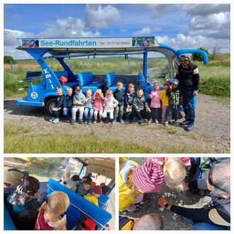 Dabei konnten die Kinder zeigen, wo sie wohnten, und Herr Vandrey erklärte ihnen vieles Wissenswertes über früher und heute. Wo ist der Salzige See hin? Was passiert im großen Romonta-Werk? Wie heizten Oma und Opa früher? … Und die wohl wichtigste Frage: Finden wir am alten Ufer versteinerte Haifischzähne?