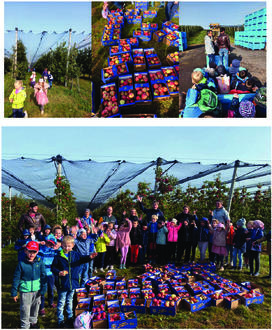 Mancher Apfel ist sehr süß wie die Sorte Pinova, anderer Apfel ist sogar säuerlich wie der Braeburn, aber eins hatten alle Äpfel gemeinsam: sie waren unglaublich lecker! Unser zweites Frühstück fiel also sehr reichlich und gesund aus. Frei nach dem Motte: „An apple a day, keeps the doctor away“ – sind wir jetzt gestärkt für den Herbst. Damit sich auch unsere Familien und Freunde einen leckeren Eindruck von den frisch geernteten Äpfeln des Obsthofes machen können, durften wir uns jeweils mindestens einen Korb Äpfel für daheim pflücken. Damit wir uns noch ein bisschen apfeliger fühlen, nahmen wir nach unseren Ernteerfahrungen den Weg ein, den unsere Äpfel normalerweise nach Ernte gegangen wären. Es ging direkt in die Obstkörbe und damit geschwind über die Plantage, Was für ein Gaudi!