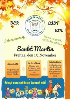 Der Förderverein und die Grundschule organisieren auch in diesem Jahr wieder gemeinsam das Martinsfest, das von den Kindern mit einem aufwendig eingeübten Programm eröffnet wird. Die Veranstaltung beginnt um 16.30 Uhr in der Kirche Wansleben. Nach dem Programm starten wir gemeinsam einen Lichter- und Laternenumzug durch den Ort, angeführt von "Sankt Martin" auf seinem Pferd. Der Rundgang endet auf dem Schulgelände, wo der Förderverein eine reichhaltige Auswahl an Köstlichkeiten für Sie vorbereitet hat.