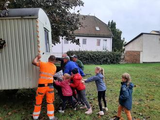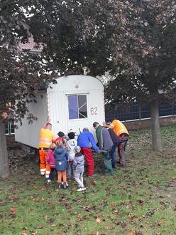 Gemeinsam mit den Ferienkindern und Gemeindearbeitern wurde der Bauwagen im Garten plaziert.