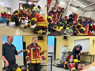 Nach einer kurzen Stärkung ging es zum praktischen Teil über. Bei diesem übte man mit den Teilnehmern Atemtechniken und das richtige Luftmanagement sowie die Selbsthilfe bei Notfällen im Trupp. Im Anschluss trainierten die Kameraden mehrere Rettungs- und Transporttechniken.