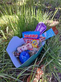 Ein großes Dankeschön gilt auch dem EDEKA-Markt in Röblingen. Kurz vor Ostern erhielten wir einen großen Karton mit Süßigkeiten. Diese wurden in gebastelte Osterkörbchen gelegt. Obenauf saß in jedem Körbchen noch ein Schokohase, der von einem EDEKA-Markt in Halle gesponsert wurde. Am letzten Schultag vor den Ferien wurden alle Osterkörbchen von unserer pädagogischen Mitarbeiterin versteckt und dann begann die große Suche. Jedes Kind fand ein süßes Osterkörbchen in unserem „Grünen Klassenzimmer“