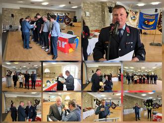 Es folgte der Punkt Beförderungen. Hier konnten sich viele Kameradinnen und Kameraden über den nächst höheren Dienstgrad freuen. Diese Beförderungen setzen gewisse Lehrgänge sowie eine entsprechende Dienstzeit voraus. Im Anschluss wurde unter dem Punkt Ehrungen Kameradinnen und Kameraden mit bestimmten Dienstzeiten bedacht. Die höchste Ehrung an diesem Abend gab es in Form des 50 jährigen Dienstjubiläum. Weiterhin gab es Ehrungen seitens des Kreisfeuerwehrverbandes. Hier wurden Kameradinnen und Kameraden für beispielgebende Verdienste im Feuerwehrwesen ausgezeichnet. Eine ganz besondere und sehr seltene Auszeichnung wurde Kamerad Volker Lorenzen zuteil. Er erhielt vom Deutschen Feuerwehrverband das Ehrenkreuz in Silber. Unter stehendem Applaus aller Anwesenden verlieh Gemeinde-Wehrleiter A. Laßbeck sowie Frank Raschke stellvertretend die Urkunde und das dazugehörige Ehrenkreuz. Ebenso überrascht war Bürgermeister a.D. Jürgen Ludwig. Er erhielt die Deutsche Feuerwehr-Ehrenmedaille für außerordentliche Verdienste im Feuerwehrwesen. Diese Medaille erhalten nur Personen, welche nicht aktiv der Feuerwehr angehören.