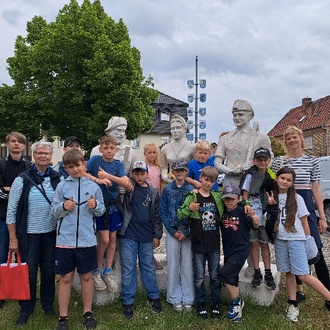 Mittwoch, den 4. Juni 2025, trafen sich die Schüler und Schülerinnen der 3. Klasse mit der Lehrerin Frau Crodel und Herrn Lohmann, der gerade hier sein freiwilliges soziales Jahr absolviert, in der Röblinger Grundschule und brachen mit Frau Dr. Meyer vom „Heimat- und Bergbauverein der Seegemeinden. Röblingen am See e.V.“ zum historischen Ortsrundgang auf. Anhand der gegenüber der Grundschule stehenden Figurengruppe sowie den Wappen der zur Einheitsgemeinde gehörenden Ortschaften erfuhren die Kinder, dass die Bewohner um den ehemaligen Salzigen See, so auch in Röblingen, sich ihren Lebensunterhalt ursprünglich mit der Fischerei verdienten. Diese Erwerbsquelle wurde mit dem Einsetzen und der massiven Erweiterung des Bergbaus sowie dem damit verbundenen Verschwinden des Salzigen See in der Folgezeit schließlich durch den Bergbau und die Landwirtschaft abgelöst. Vorbei an der alten Gemeinde führte der Weg anschließend zum vor dem neuen Verwaltungsgebäude liegenden Bauernstein, der einst der Ort der Gerichtsbarkeit war. Vorbei an dem ehemaligen Gut, dessen Schafstall heute die beliebte Festscheune ist, ging es in die Lange Straße 11, wo sich einst die Rezeptur der Sparkasse befand. Von da aus führte der Weg zum Gebäude der ehemaligen Posthalterei im einstigen „Gasthaus zum Salzsee“ in der Bahnhofstraße 9, in dem auch Friedrich der Große seine Pferde wechselte, neben dem späteren Volkslichtspieltheater. Das Kino kannten einige der Kinder aus Erzählungen ihrer Eltern und Großeltern. Auf dem Weg zum letzten Ziel des Rundgangs in der Großen Seestraße 20 erfuhren die Kinder, dass es allein in dem Karree Bahnhofstraße/Ecke Große Seestraße einmal zwei Kaufhäuser und fünf große Gasthöfe sowie ein Möbelhaus gab. Beim Durchlesen der letzten Tafel auf diesem Rundgang lernten sie, dass der heutige Hort früher einmal ebenfalls ein Gasthof - der „Gasthof zum Kronprinzen“ - war und hier 1932 prachtvoll das 1000jährige Jubiläum von Röblingen begangen worden ist. Damit endete der diesjährige Rundgang durch die Geschichte von Röblingen und machte bereits neugierig auf einen neuen im nächsten Schuljahr.