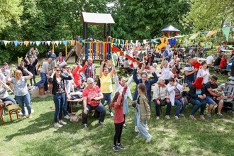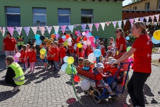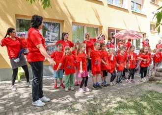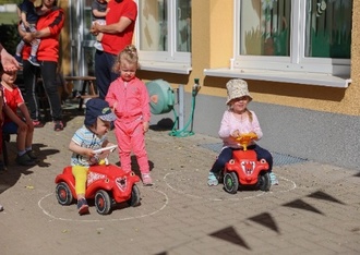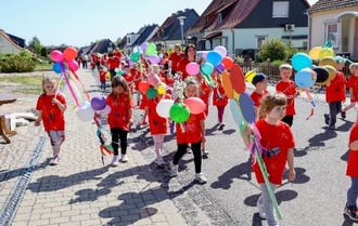 Alle Kinder, viele Eltern, Omas und Opas sowie das Erzieherteam liefen mit bunt geschmückten Stöckchen, zünftiger Marschmusik und bestem Sonnenschein durch die Straßen der Neuen Siedlung. Alle Kinder hatten ein rotes T-Shirt an, welches sie selbst gestaltet hatten.