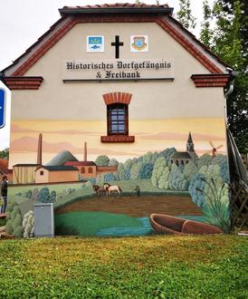 Seit Mai 2025 ziert die Giebelwand des alten Dorfgefängnis in Wansleben ein Graffiti, dass die Historie des Ortes abbildet.