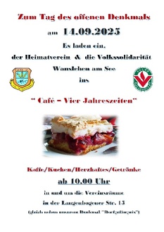 Zum Tag des offenen Denkmals, am 14.09.2025 ab 10.00 Uhr, wenn der Heimatverein das ehemalige Dorfgefängnis/Freibank für Besucher öffnet, lädt das „Café Vierjahreszeiten“ zum „Herbst-Kaffeeklatsch“ und freut sich auf viele bekannte und neue Gesichter.