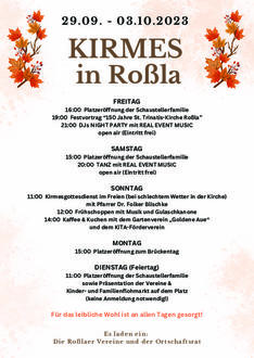 Neben all diesen geplanten Veranstaltungen können sich unsere Besucher auf kulinarische Genüsse freuen, die an allen Tagen angeboten werden. Die Kirmes ist auch in diesem Jahr wieder eine Gelegenheit, im Herzen Roßlas zusammen zu kommen und zu feiern.