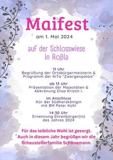 Das Roßlaer Maifest ist zurück und verspricht einen Tag voller Freude, Gemeinschaft und Unterhaltung für die ganze Familie! Wir laden Sie herzlich ein, am 1. Mai 2024, ab 11 Uhr, mit uns auf der Schlosswiese in Roßla zu feiern.