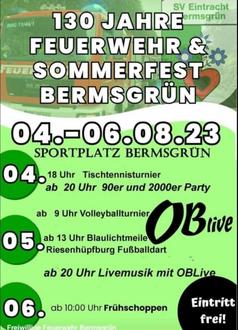 Auch in diesem Jahr wird wieder zusammen mit der Freiwilligen Feuerwehr Bermsgrün e.V. das gemeinsame Sommerfest in Bermsgrün gefeiert.