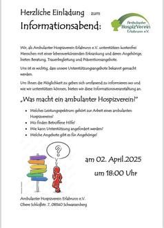 Die Veranstaltung findet am 2. April um 18:00 Uhr in den Räumen des Vereins in Schwarzenberg, Obere Schloßstraße 7, statt. Der Hospizverein möchte mit diesem Abend Aufklärung leisten und Raum für Fragen und Austausch bieten.