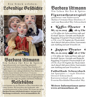 Am 15. Oktober 2025 präsentiert der Förderverein Barbara-Uttmann-Haus Elterlein e.V. erneut „Barbara Uttmann – Ein Leben für Erz & Spitze“ zum „Kaffee-Theater“. 14 Uhr öffnet der Salon und bietet süße und herzhafte Speisen, Getränke und Raum für Begegnung & Gespräch. Theatereinlaß ist ab 15 Uhr, 15:30 Uhr beginnt das Theaterstück. Auch danach lädt unsere kleine Gastronomie zum Ausklang und zum Verweilen ein. „Suppen-Theater“ heisst es dann am 22. Oktober 2025. Der Salon öffnet ab 17 Uhr und lädt bei herzhaften Speisen und Getränken zum Verweilen ein. Das Theater öffnet ab 18 Uhr, 18:30 Uhr beginnt das Theaterstück. Auch danach ist unsere kleine Gastronomie zum geselligen Ausklang geöffnet. Begleiten Sie uns auf eine Geschichtsreise in die Renaissance auf den Spuren einer außergewöhnlichen Frau, Barbara von Elterlein, besser bekannt als Barbara Uttmann. Leben und Werk, Freud und Leid der berühmten Verlegerin, Bergherrin, Unternehmerin, Ehefrau und 12-fachen Mutter beleuchtet unser Figurenspiel. Die handgefertigten Puppen stehen für Tradition und Brauchtumspflege, denen der Förderverein Barbara-Uttmann-Haus Elterlein e.V. verpflichtet ist. Zwischen Erz, Borte und Spitze entspinnt sich die berührende Lebensgeschichte unserer Vorfahren aus der Erzgebirgsheimat hautnah vor den Augen der großen und kleinen Zuschauer. Veranstaltungsort für Vorführungen ist die Fußballbude in Elterlein, Ortsteil Schwarzbach. Tickets gibt es unter www.uttmannhaus.de und www.eventim.de.
