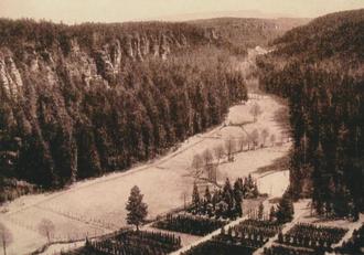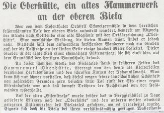 Auf dieser alten Ansichtskarte sehen wir den wahrscheinlichen einstigen Standort des Eisenhammerwerkes „Oberhütte“. Zwischen dem baumbestandenen Biela-Bogen und dem damaligen Waldrand waren regelmäßige Bodenerhebungen zu erkennen, welche als Spuren einstiger Gebäudeanlagen gedeutet wurden. Auch verschiedene Beschreibungen in der Literatur deuten auf diesen Standort hin.