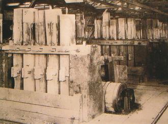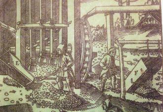 Erzpochwerk mit Wasserradantrieb, wie es sicher auch in den Hüttenwerken des Bielatales vorhanden war.