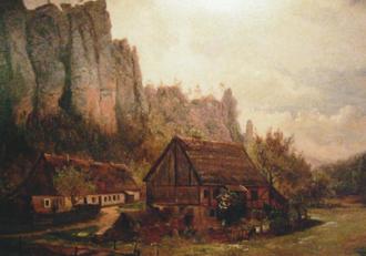 Das alte Hammergut der „Oberhütte“ bei der Schweizermühle auf dem Gemälde eines unbekannten Malers aus der Mitte des 19. Jahrhunderts, bei der Anlage der Baumschule abgerissen. Auf Hermann Krones erster Aufnahme der Schweizermühle 1853 ist das Gut noch zu sehen.