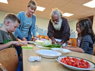 Danach gestaltete Herr Goswami mit der 3. und 4. Klasse einen Koch-Vormittag mit indischen Gerichten. Mit viel Liebe und Geduld führte er die Kinder in die indische Tempelkunst ein. Gemeinsam schnippelten alle Gemüse, schälten Kartoffeln oder schnitten Käse. Die Ergebnisse konnten sich sehen und schmecken lassen. Als leckere vegetarische Gerichte standen am Ende auf dem Buffet: Reis, Spinat mit Käse und Joghurt, gemischtes Gemüse mit Paprika, Möhren, Kartoffeln, Spitzkohl und Joghurt mit geriebenen Gurken. Das leckere indische Gewürz Garam Masala durfte natürlich auch nicht fehlen.
