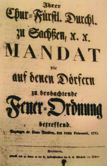 Aber erst relativ spät, im Jahre 1775, erließ Kurfürst Friedrich August III. von Sachsen ein „MANDAT die auf den Dörfern zu beachtende Feuer-Ordnung betreffend, Dresden, den 15.Februar 1775“.