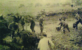 Entschlammen Feuerlöschteich bei Martin Kretzschmar auf der Rosenthaler „Heide“ durch die FFW Rosenthal und Helfer, 1952