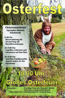 Der Tourismusverein und die Freiwillige Feuerwehr von Rosenthal-Bielatal laden alle Einwohner und Gäste am Sonnabend, dem 08.04.2023, auf den Sportplatz Bielatal, Schulstraße, zu einem Großen Osterfest ein.