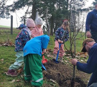 Mit Schaufeln und Harken haben die Kinder die Pflanzaktion unterstützt. Mit den Baumanhängern und der Baumpatenurkunde war das eine schöne gemeinsame Aktion, bei bestem Wetter.