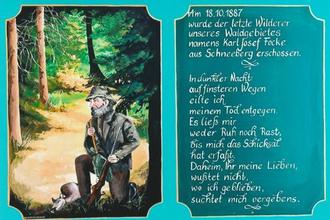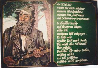 Die Beschriftung teilt uns mit: „Am 18.10.1887 wurde der letzte Wilderer unseres Waldgebietes namens Karl Joseph Focke aus Schneeberg erschossen“.