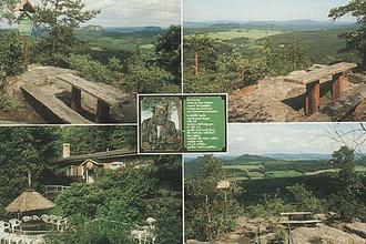 Die Ansichtskarte zeigt die „Katzsteinbaude“ und Ansichten des Aussichtspunktes „Signal“ mit den vom Chronisten H.-G. Hering gestalteten Info-Tafeln (um 1998).