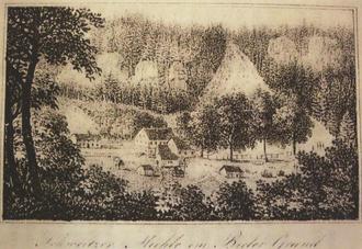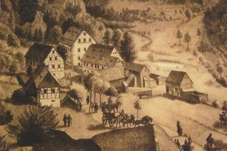 Älteste bekannte Darstellung der „Schweizermühle im Bieler Grund“ aus dem Jahre 1838