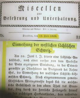 „Einweihung der westlichen sächsischen Schweiz. Am 20. Juni d.J. feierte eine fröhliche Gesellschaft, nach einer vorher von dem „Verfasser der Biela“ ergangenen Einladung, in der Schweizermühle zu Oberhütten im Bielagrunde bei Rosenthal, die Einweihung der westlichen sächsisch-böhmischen Schweiz. Nach eingenommenem gemeinschaftlichem Mittagsmahle begab sich die ansehnliche Gesellschaft in den oberen Theil des Grundes, stieg durch die herrliche Felsengasse hinauf zu den prächtigen Herkulessäulen, dem vollendetsten Meisterwerke der Natur in der ganzen östlichen und westlichen sächsischen Schweiz und ging sodann in den nahe dabei befindlichen, gleichfalls hohes Interesse erregenden Tempel der Natur. Während dieser Zeit war auf dem gegenüber befindlichen hohen Paulsstein ein Musik-Chor aufgestellt, wodurch der Genuß unendlich erhöht wurde.