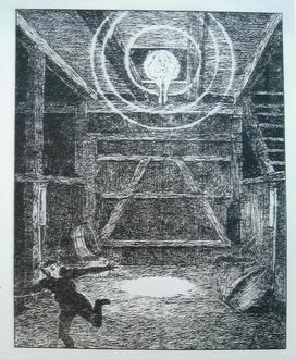 Hans fällt vor Schreck fast nach hinten über, rennt schließlich davon und kommt kreideweiß in die Küche. Man fragt ihn deswegen, aber er will nicht mit der Sprache heraus, weil er sich schämt. Doch endlich stottert er, in der Scheune hätte es eben gescheecht. Nach einer Weile rückt man gemeinsam hinüber, um nachzuschauen, findet aber nichts. Der Knecht aber schwört „Stein und Bein“, dass er das Gespenst deutlich gesehen habe! Manche lachen ihn aus, aber einige glauben ihm auch heimlich! – Nach ein paar Tagen geht die Mittelmagd abends noch Heu vom Oberboden holen. Sie stellt die Laterne auf die Tenne und steigt mit dem Heukorb die steile Treppe hinauf. Eilig drückt sie im fast Finstern Heu hinein. Beim Abwärtssteigen muss sie doch mal nach dem Banselloch hinübergucken. Da stößt sie sogleich einen furchtbaren lauten Schrei aus, lässt den Korb hinunterpoltern, stolpert selbst und fällt zu ihrem Glück in’s Heu. Entsetzt schaut sie nach oben. Wahrhaftig, da sitzt noch das bleiche Gespenst und die schlenkernden Beine sind dürr und weiß wie Totenknochen. Auf das Poltern und Schreien hin kommt die Großmagd gerannt und zerrt die zu Tode Erschrockene schnell auf den Hof. Als die anderen Leute zu Hilfe kommen wollen, ist wieder nichts mehr zu sehen. Seitdem ist aber tunlichst niemand mehr bei Dunkelheit in die Scheune gegangen.