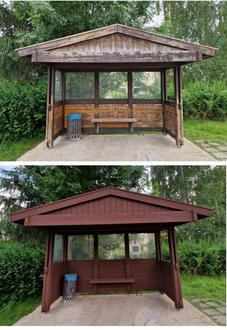Nachdem das Wartehäuschen geschliffen war und wir das Dach von Steinen und Ästen befreiten, kam auch schon die neue Farbe drauf, welche von der Gemeinde gestellt wurde. Zum Glück half uns die Firma Farbnuance und Niklas Schramm bei der Reinigung, das erleichterte das Schleifen.