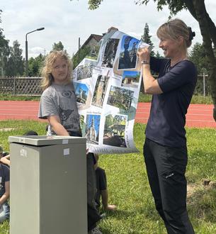 Nun berichteten die Klassen 1 – 4, während alle gemütlich auf der Wiese saßen, was sie unterwegs gesehen hatten. Unterstützend für ihre Berichte hatten sie einige der aufgehängten Schilder dabei. Diese wurden dann in eine große Box gesteckt – und – wie durch ein Wunder – nachdem Frau Münzberg die Box geschüttelt hatte, kam ein ganz großes Plakat für unser Schulhaus heraus, auf dem sich alle Erlebnisbilder befanden. Wir freuen uns, dass wir dies zur Erinnerung nun aushängen können!