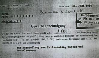 Laut Eintrag in die Gewerbeerlaubnis-Akten Hermsdorf/Bielatal wurde Herrn Ritschel am 14. Juni 1954 dann doch die ersehnte Gewerbeerlaubnis erteilt – „Gewerbe zur Herstellung von Reißzwecken, Rohrklammern und Nägeln“ in Bielatal A Nr. 1 F (ehemalige Rittergutsfabrik)