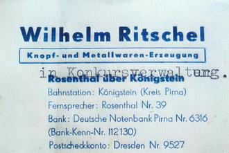Briefkopf der Knopffabrik Wilhelm Ritschel in der Rosenthaler Parisiusmühle“ – vor der Vertreibung 1945 Eiland Nr. 39 (Knopffabrik).