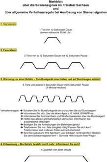Des Weiteren stellen wir Ihnen noch einmal das Merkblatt über die Sirenensignale im Freistaat Sachsen und über allgemeine Verhaltensregeln bei Auslösung von Sirenensignalen zur Verfügung.