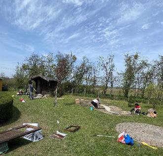 Gemeinsam packten es Eltern und Erzieher an. Bei schönem Sonnenschein trafen sich vor allem Eltern aus dem Krippenbereich und die Erzieherinnen der Einrichtung, um das Außengelände auf Vordermann zu bringen. So wurde das Spielhäuschen der Kinderkrippe von innen abgeschliffen und anschließend in strahlenden Farben neu gestrichen. Außerdem wurden alle Rabatten vom Unkraut befreit, Bäume verschnitten, Blumen gepflanzt, Spielgeräte gesäubert, das Seepferdchen mit den Barfußpfaden erneuert und vieles mehr.