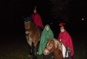 Der Höhepunkt unseres Festes war der Auftritt von Sankt Martin und Sankt Martin Junior auf ihren Pferden und dem Bettler, welche für uns die Martinsgeschichte vorführten. Frau Töfke las die Geschichte vor und verteilte symbolisch das „geteilte Brot“.