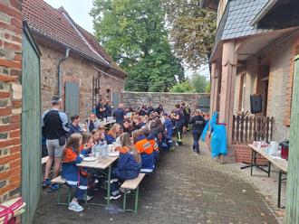 Nun führten die letzten Kilometer der Wanderung am Burggraben entlang zum Gerätehaus in Domnitz. Um 12:10 Uhr liefen die Jugendlichen am Gerätehaus ein, wo der Durst erstmal mit einer Cola gelöscht wurde. Auch die Mägen waren leer und es wurde direkt übergegangen zum Mittagessen - Nudeln und Bolognese.