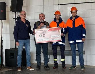 Kurz nach 16:00 Uhr besuchten der Gründungsjugendwart, Horst-Dieter Wolski, und sein 1. Maschinist, Rolf Berger, mit zwei der ersten Jugendfeuerwehr-Mitglieder, Philipp Wächter und Frank Schwarz, das Fest und hatten etwas Besonderes im Gepäck. Im Namen des Domnitzer Feuerwehrverein e.V. überreichten sie den Jugendlichen einen Scheck für eine dreitägige Teamfahrt nach Naumburg ... WOW ... die Jugendfeuerwehr sagt DANKE.